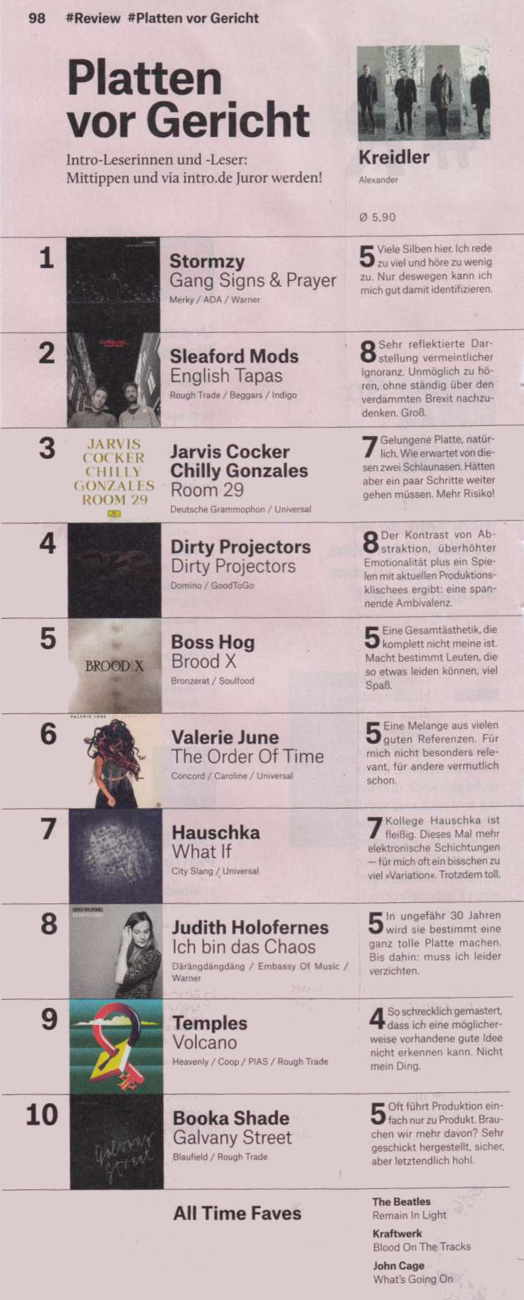 Sicherlich, eine direkte Antwort auf die momentanen Probleme ist die neuste Scheibe von Kreidler nicht — aber auch keine Verleugnung. Man spürt die Absichten und mit sich immer stärker steigernden Liedern baut die Band eine gute Spannung auf. Somit ist ‟European Song” ein Gemeinschaftswerk und präsentiert Musiker, die fantastisch aufeinander abgestimmt sind. Und ja, auch die billig wirkenden Klänge aus den Synths sind gewollt — in der heutigen Zeit glänzt schliesslich auch nicht alles. Aber wir sind alle gemeinsam da, wie Kreidler es vormachen.