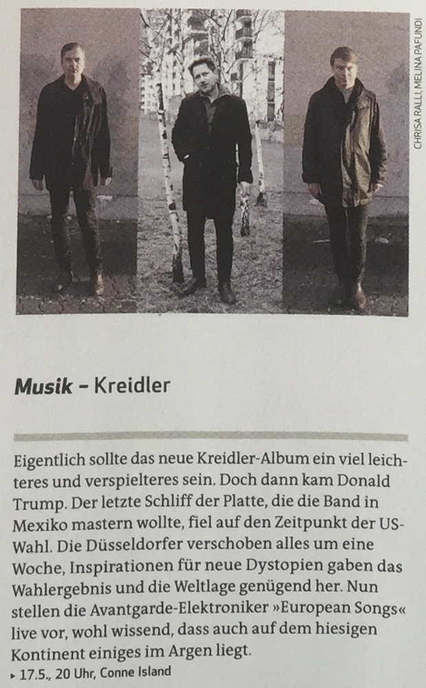 Dass Instrumentalmusik durchaus politisch sein kann, beweisen Kreidler einmal mehr mit ihrer neuen Platte „European Song“. Eigentlich sollte es wohl ein leichtes, verspieltes Album werden, Aufnahmesessions in Mexiko brachten vielversprechende Ergebnisse. Doch dann wurde in den USA gewählt, und vorbei war es mit der Leichtigkeit. Es spricht eine ungeheure Wut aus diesem Album, und gleichzeitig eine Entschlossenheit, sich dieses Europa nicht von den Trumps und AfD-Honks dieser Welt kaputtmachen zu lassen.