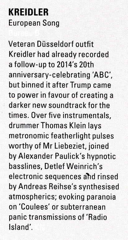Progressive stalwarts Kreidler were some distance into piecing together a new album in 2016 when almost overnight, a certain rich and self-satisfying embodiment of all that was culturally and sociably intolerable in '30s/'40s Europe trounced opinion polls to spread his own 21st-century new world order in his own homeland. Thus European Song was born and this quartet end up creating their most intense yet coherent cohesive long-player to date.