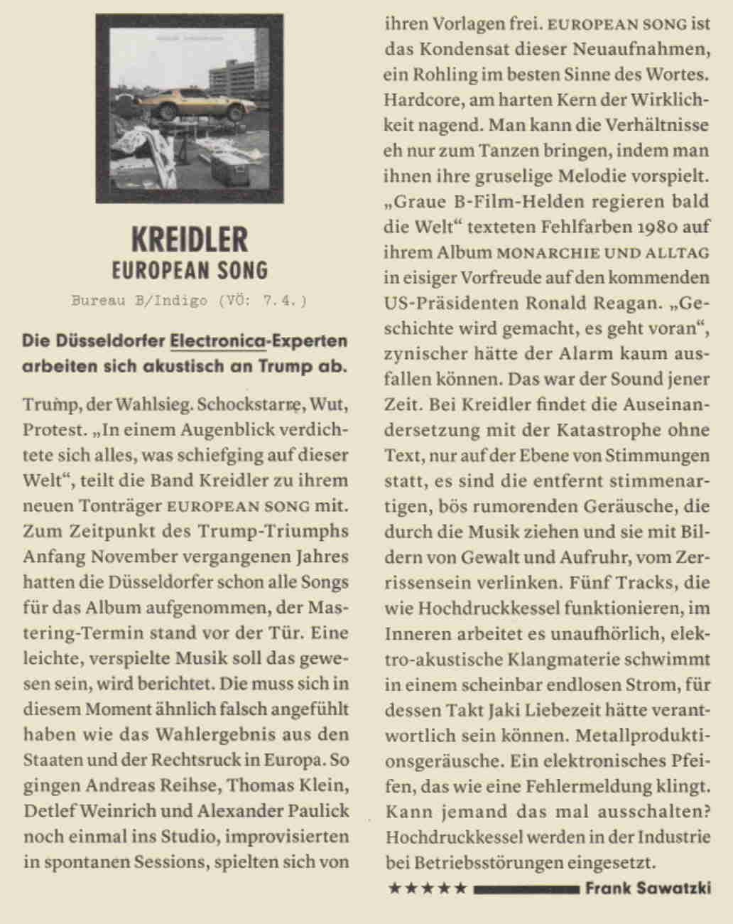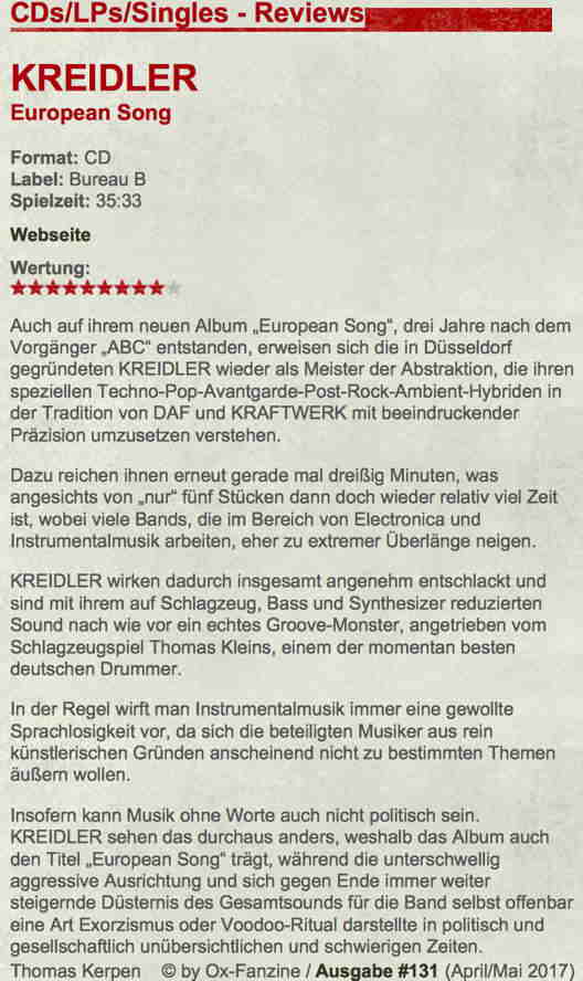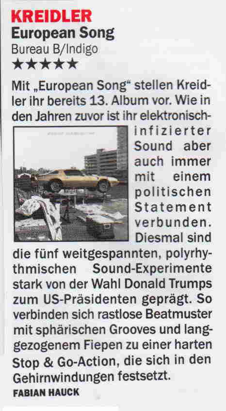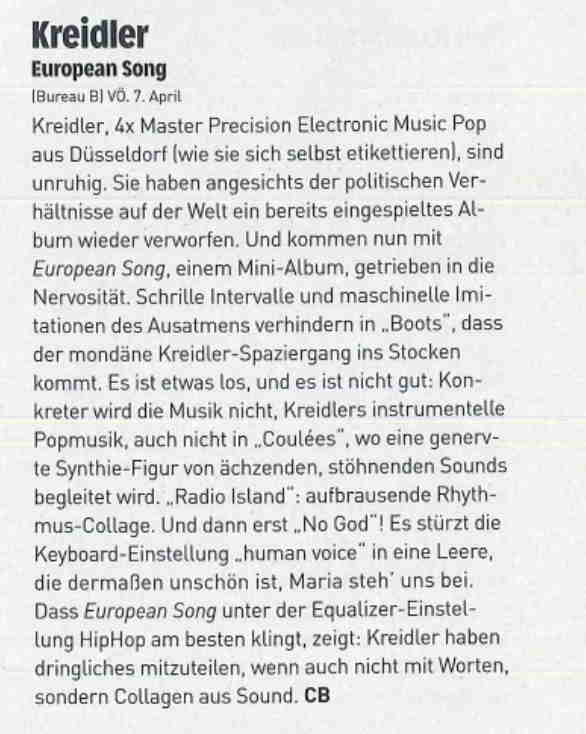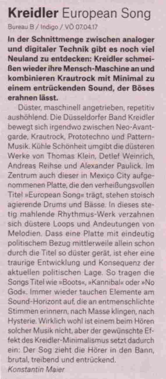 Auch auf ihrem neuen Album European Song, drei Jahre nach dem Vorgänger ABC entstanden, erweisen sich die in Düsseldorf gegründeten KREIDLER wieder als Meister der Abstraktion, die ihren speziellen Techno-Pop-Avantgarde-Post-Rock-Ambient-Hybriden in der Tradition von DAF und KRAFTWERK mit beeindruckender Präzision umzusetzen verstehen.